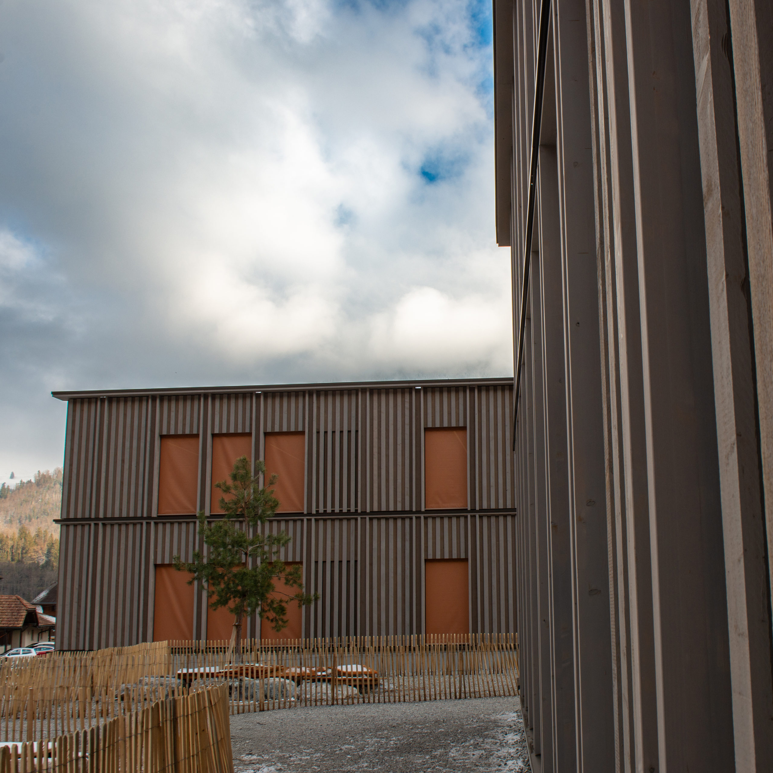Pour l’habillage de ces deux bâtiments, le maître de l’ouvrage a choisi de le faire en mélèze issu des forêts de la commune de Charmey.