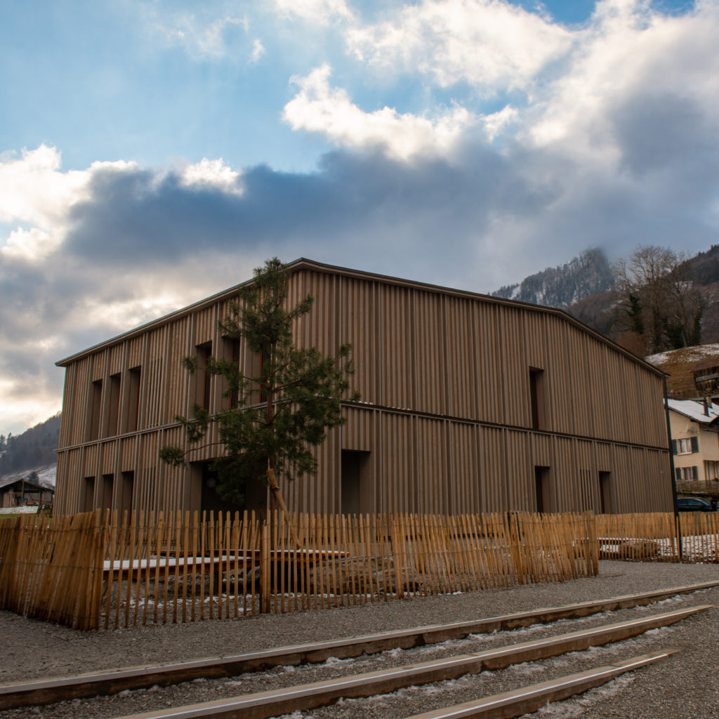 Nous avons réalisé les revêtements de ce complexe à l’aide d’éléments extérieurs de façades préfabriquées dans nos ateliers. Ces près de 1’000m2 de façades sont composées d’un voile noir en Stamisol, d’une sous-construction peinte en noire et d’un revêtement en sapin blanc ajouré irrégulier prégrisaillé.