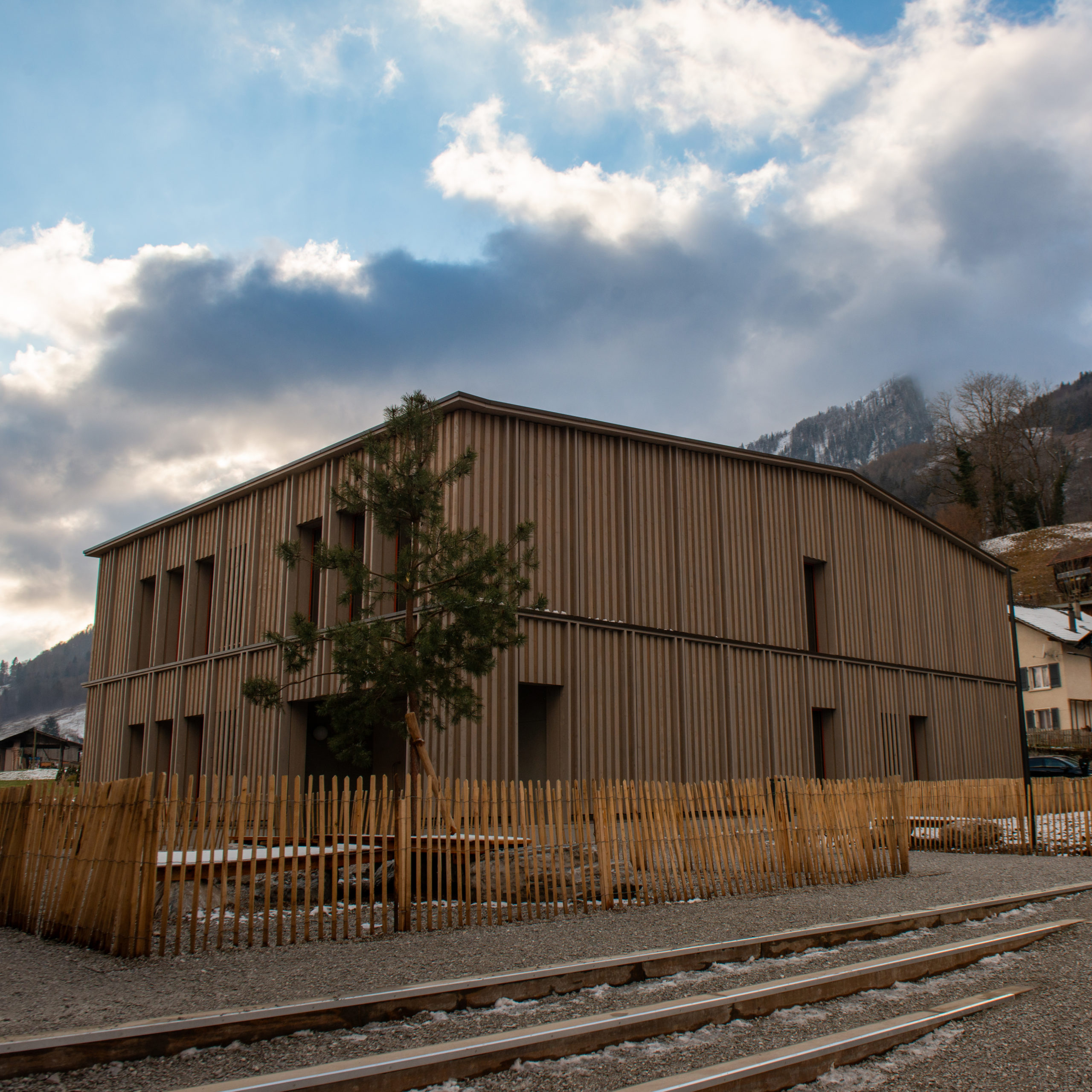 Nous avons réalisé les 1'000 m2 de revêtements de façades de ce complexe en lames irrégulières prégrisaillées, en plus des revêtements nous avons également posé l’isolation et les sous-construction.