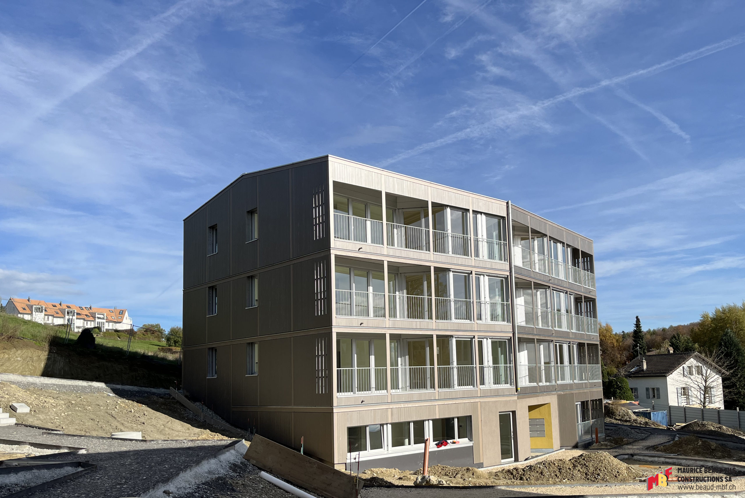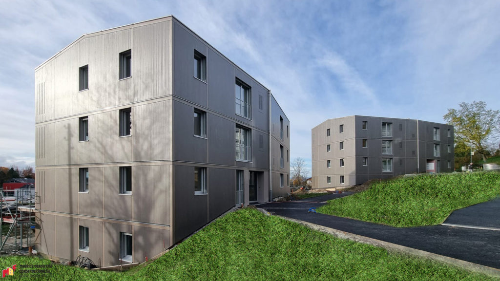Nous avons réalisé les revêtements extérieurs de ces deux immeubles Minergie. Ce sont plus de 1’750 m2 de lames en sapin blanc avec un traitement qui ont été posées par nos soins. En plus des revêtements nous avons également fait toute la sous-construction ainsi que l’isolation. Tout le bois utilisé pour ces revêtements et sous-construction est entièrement suisse.