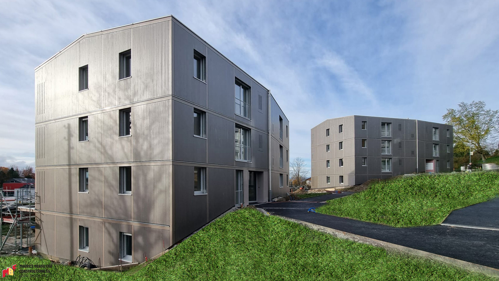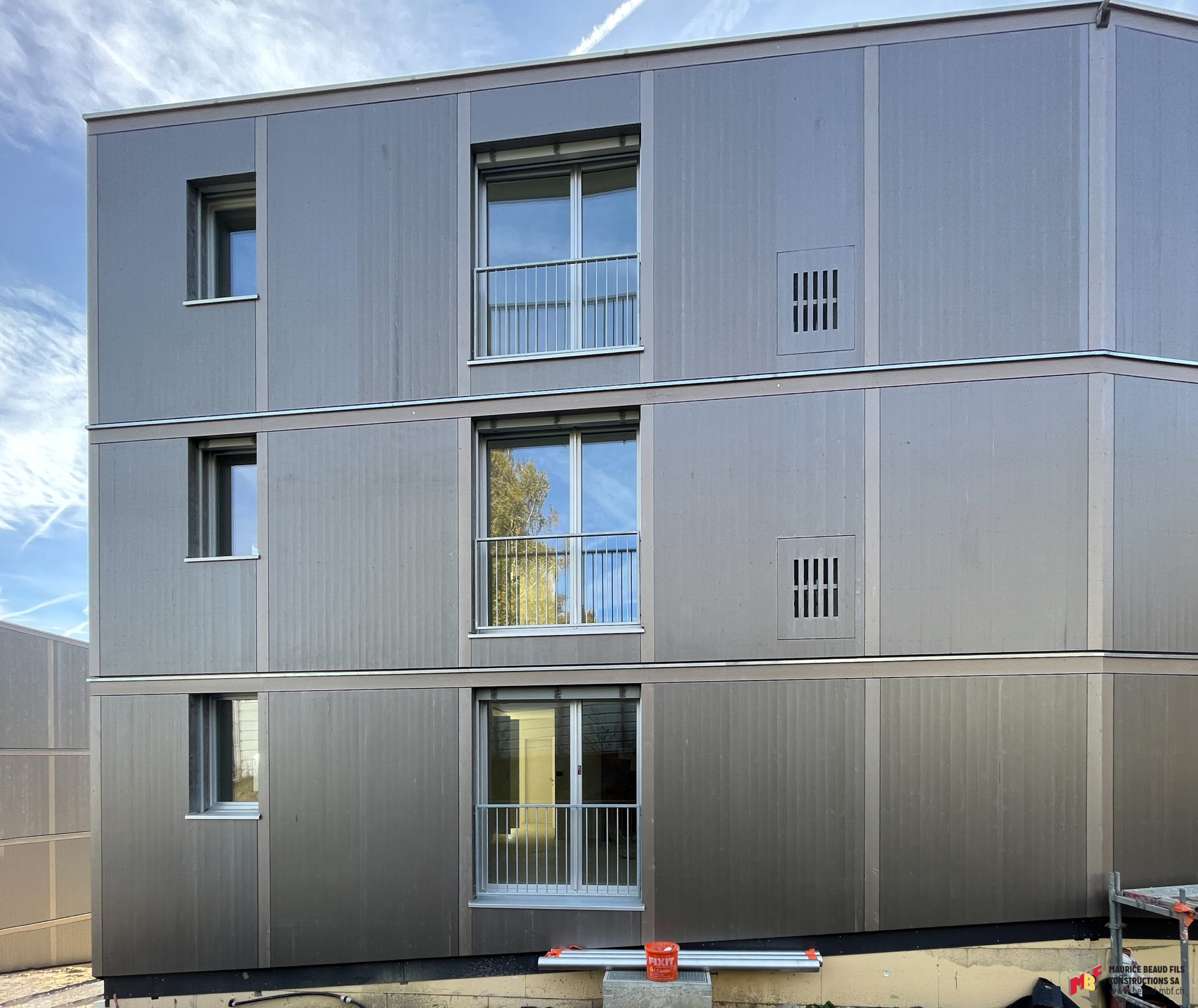 Nous avons réalisé les revêtements extérieurs de ces deux immeubles Minergie P ECO. Ce sont plus de 4'400 m2 de lames prégrisaillées Ecogris qui ont été posées par nos soins. En plus des revêtements nous avons également fait toute la sous-construction ainsi que l’isolation et les aménagements de balcons.